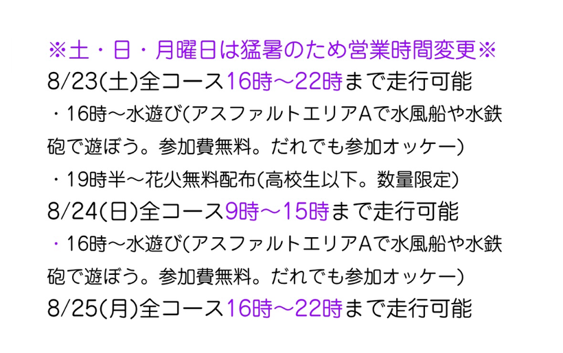 21日 8月 2025 猛暑は続く こんにちは。せこです。 3日間のお休みをいただき今日から営業再開です。 お盆が過ぎたのにまだまだ猛暑が続きます。 熱中症対策のため土・日・月曜日の営業時間を変更します。 水遊びと花火の無料配布も行います。 気軽にご参加ください。 またダートジャンプ外側はイベント用のままになっています。 チャレンジしたい方はぜひお越しください! tagPlaceholderカテゴリ: ブログ